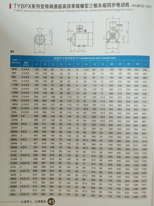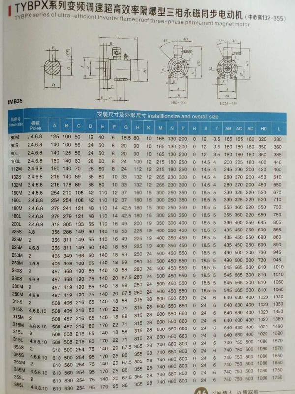 TYBPX隔爆型永磁同步電機型號的含義為:T代表同步;Y代表永磁;B代表隔爆:Px代表高效變頻。組合在一起就是變頻調速高效率永磁同步電機。